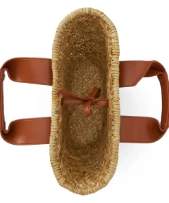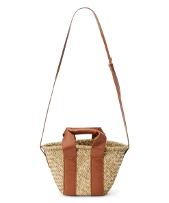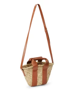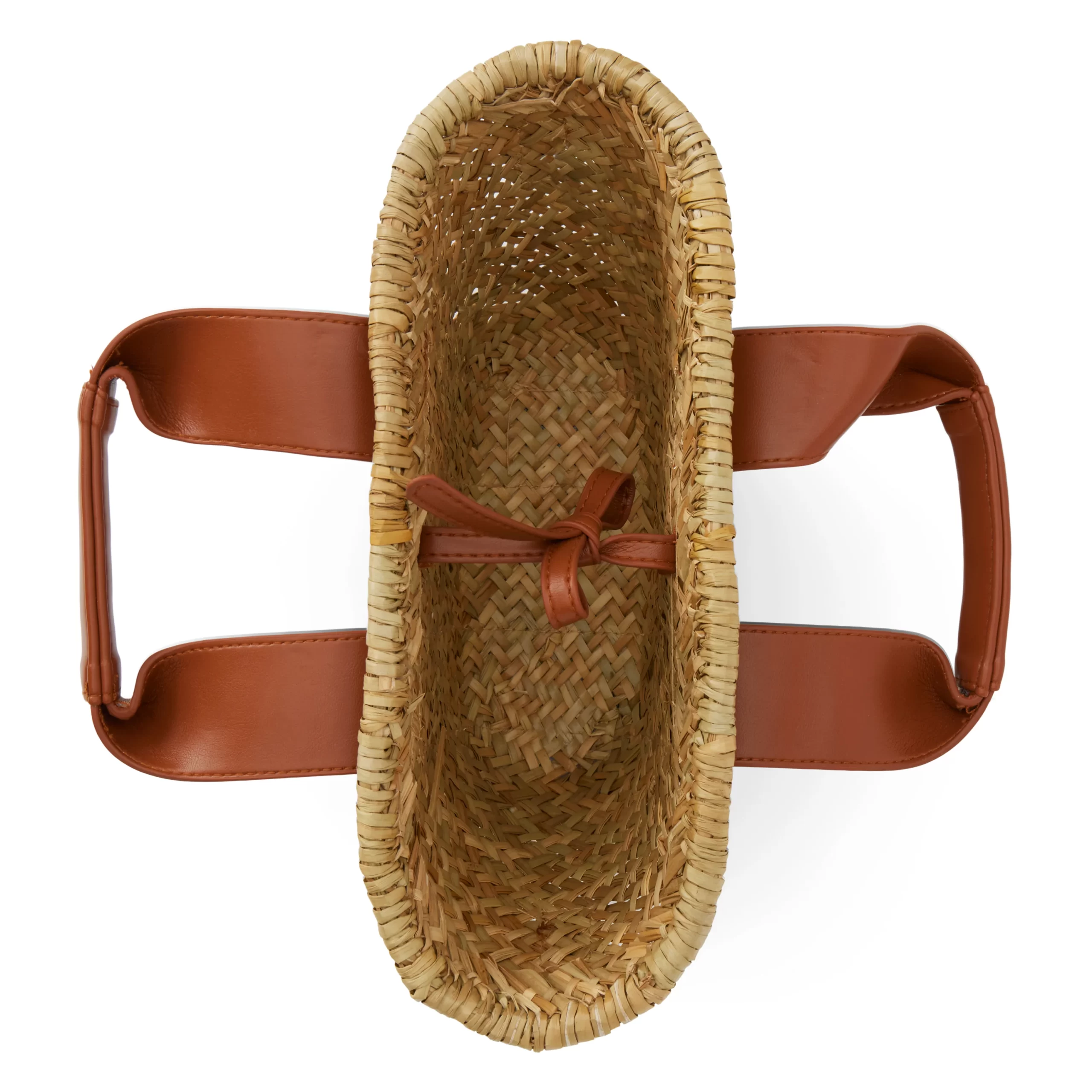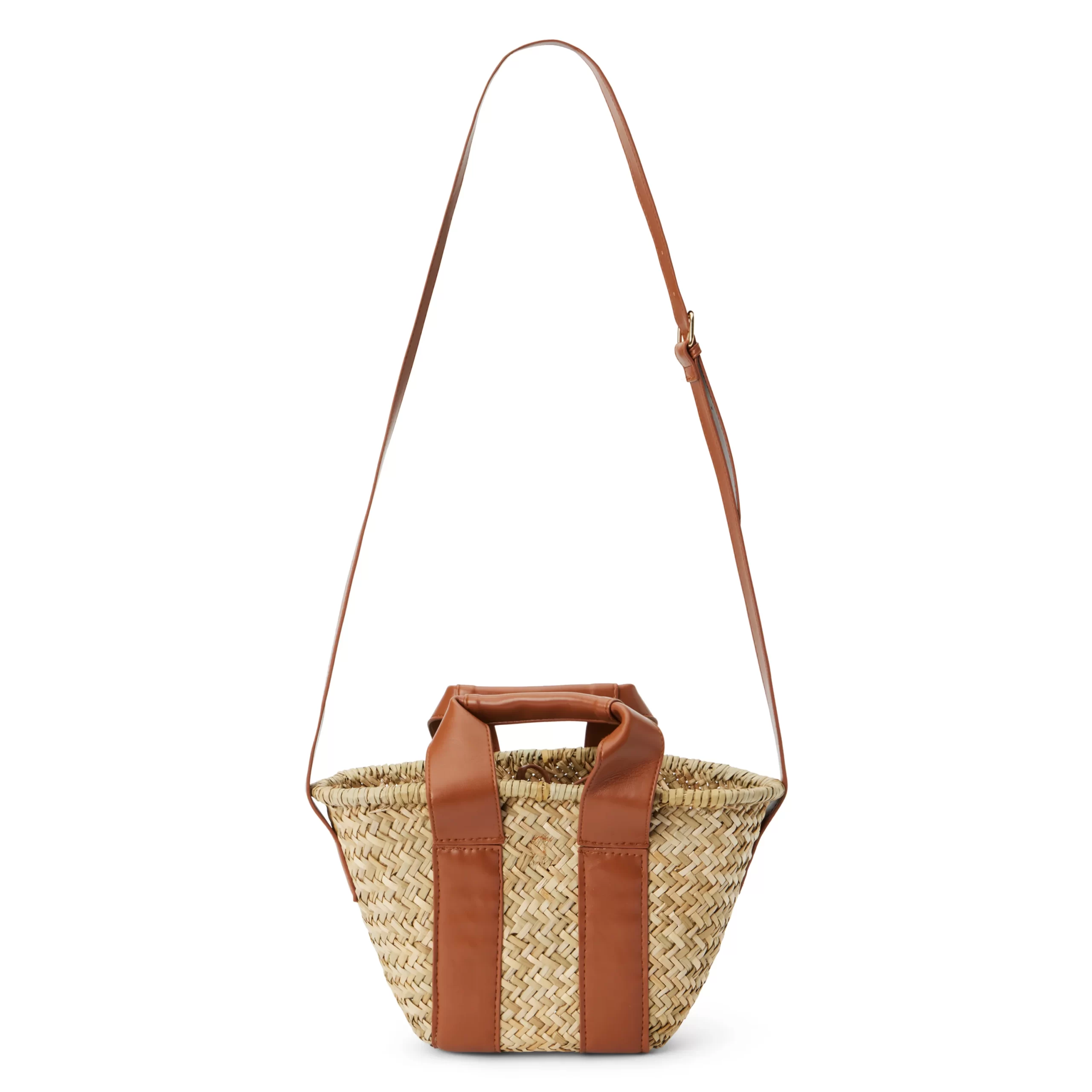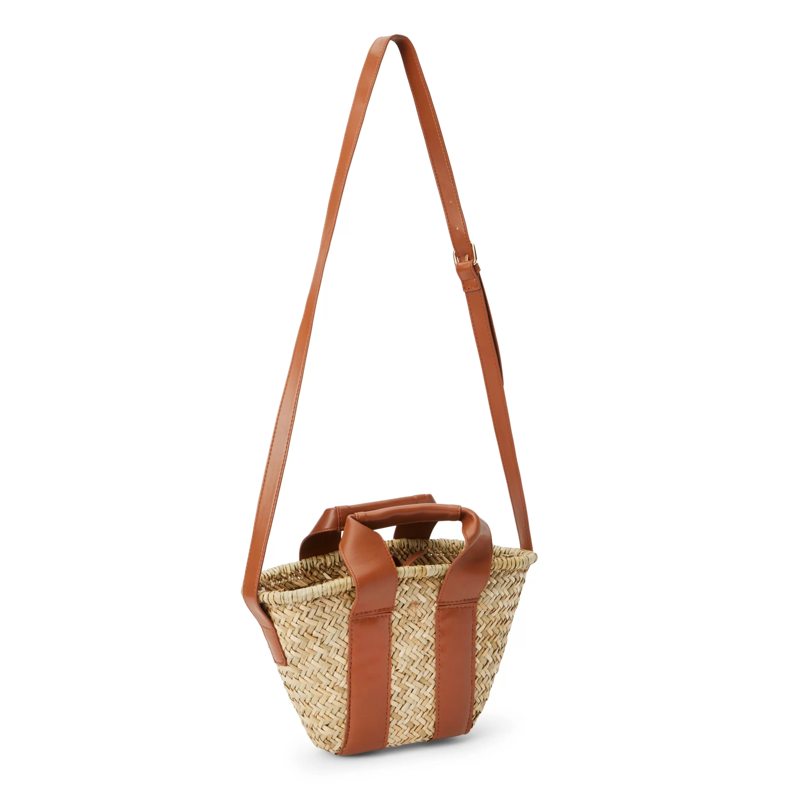 Woven raffia bag with vegan leather top straps and adjustable shoulder strap.