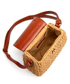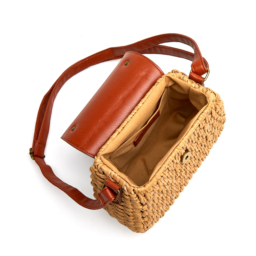 Versatile top-handle crossbody bag made from raffia and smooth, vegan leather.