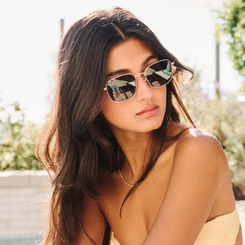 Chic, square sunglasses designed with a minimalist metal frame and polarize lenses.