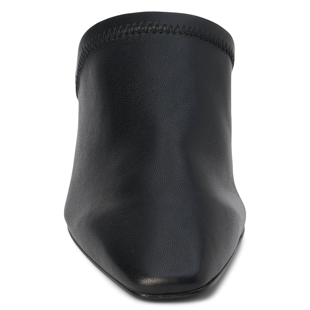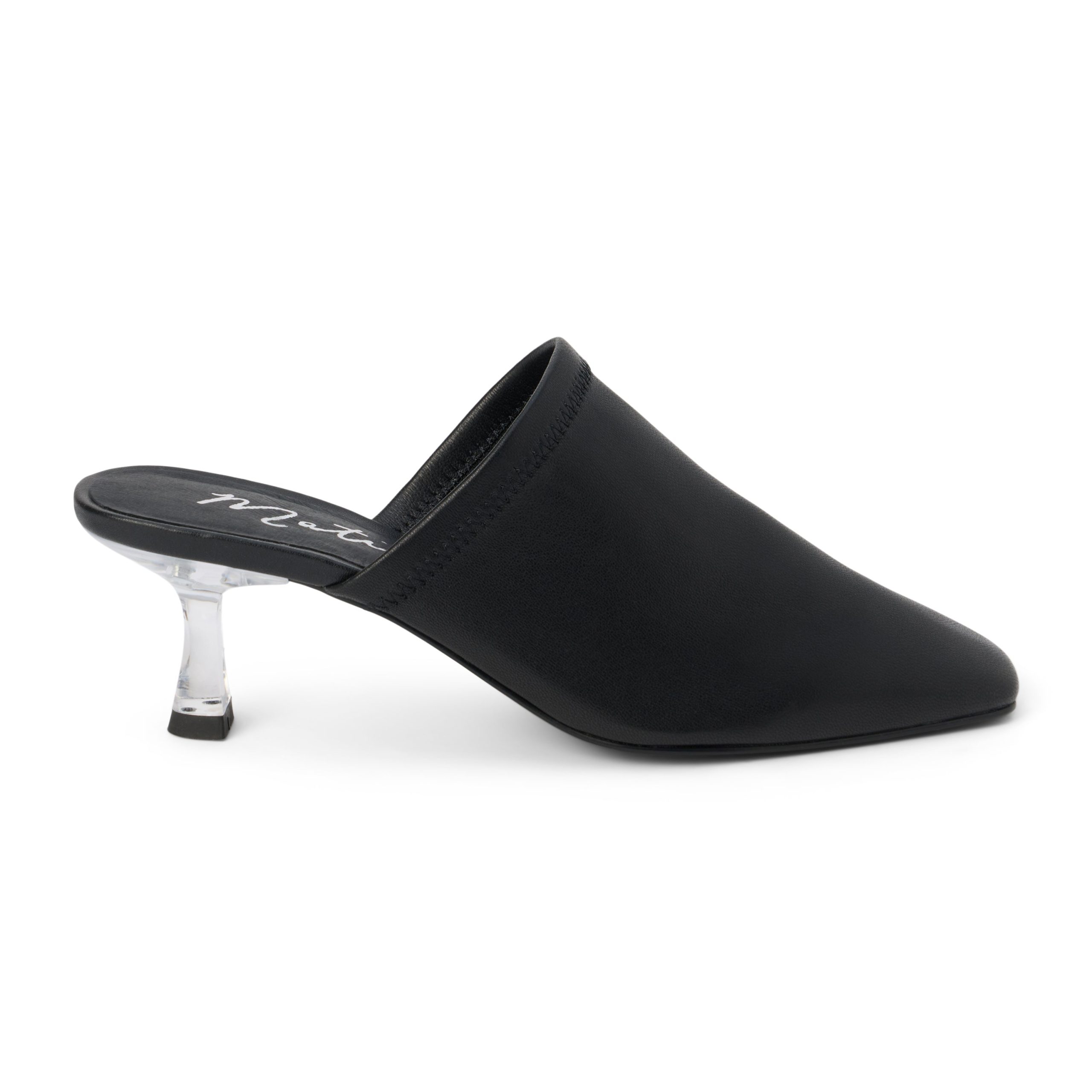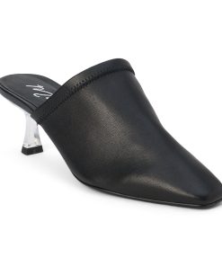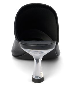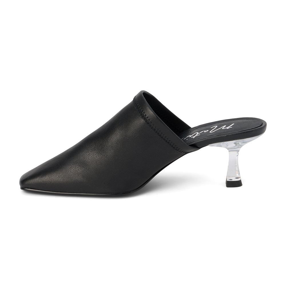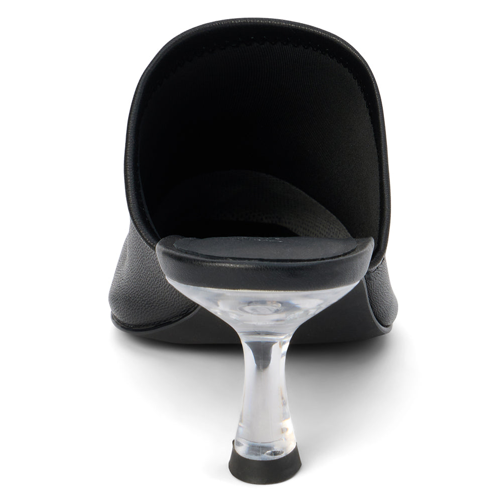 Pointed toe mule with sculpted acrylic heel.