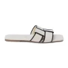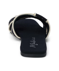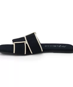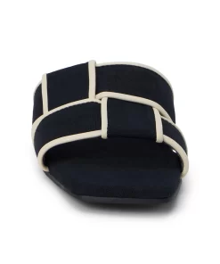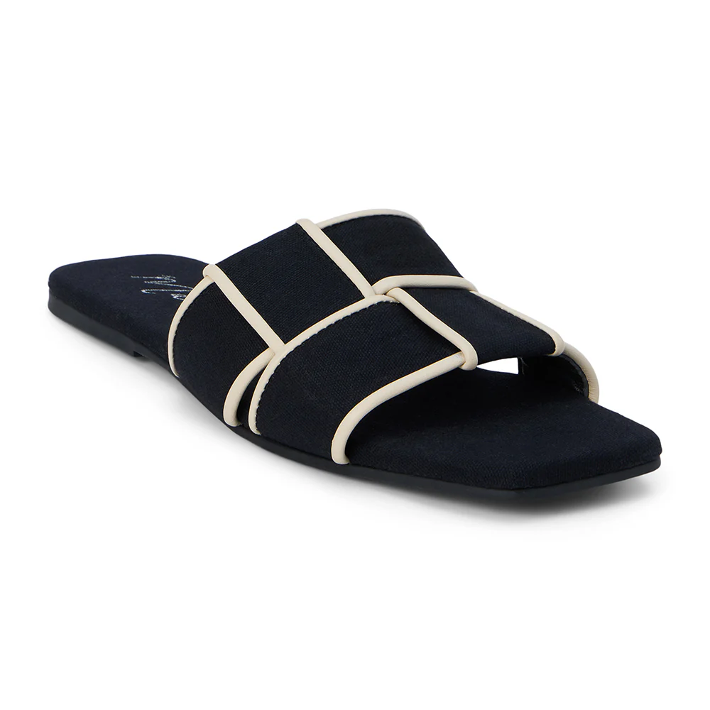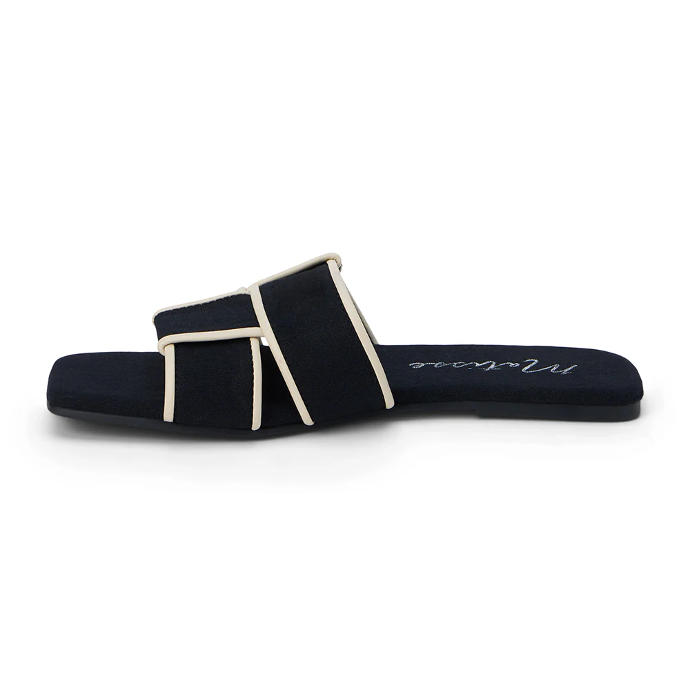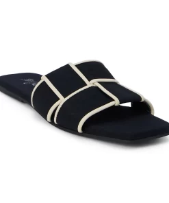 Chic, flat sandal with woven band and squared toe.