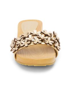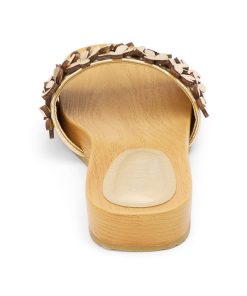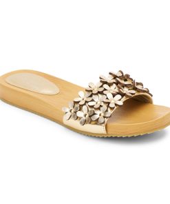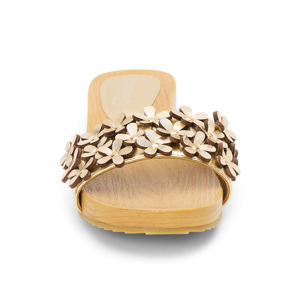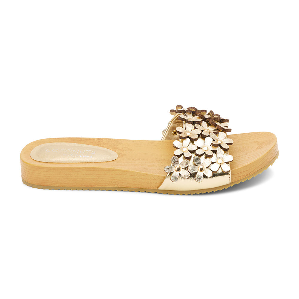 Vegan, one band sandal with flower appliqué.