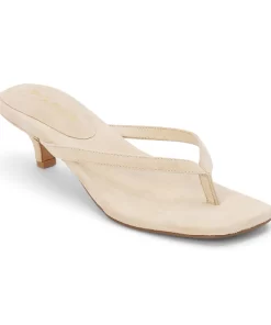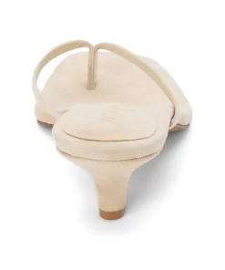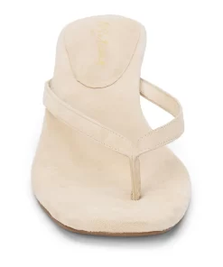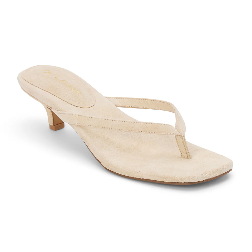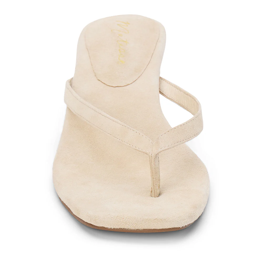 Natural suede thong sandals with a square toe, cushioned footbed, and sleek kitten heel. A minimalist yet sophisticated design perfect for effortless day-to-night styling.