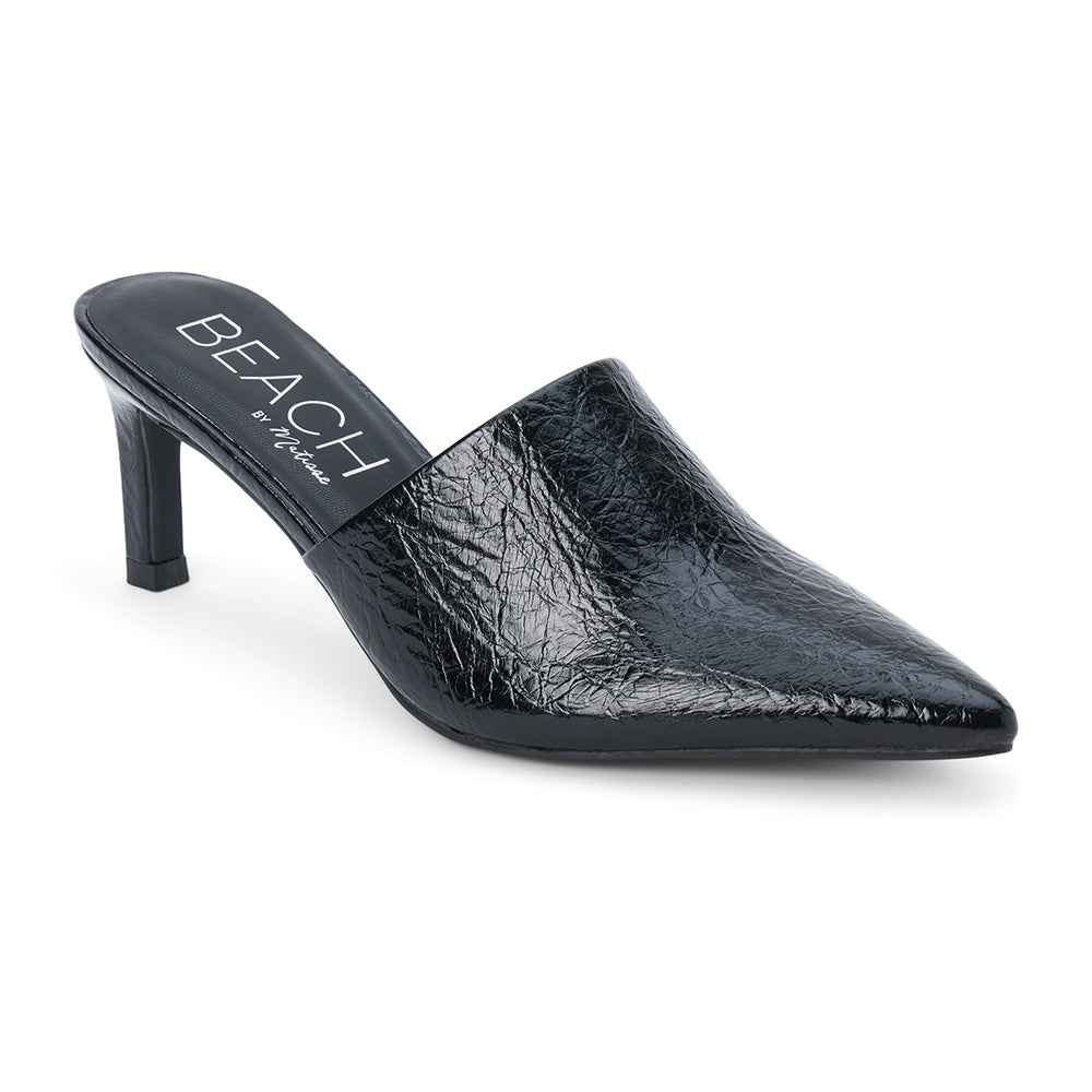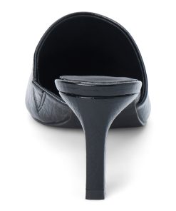 Black pointed-toe slip-on mule with textured finish and stiletto heel.