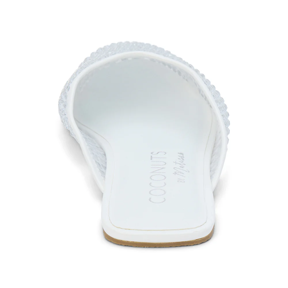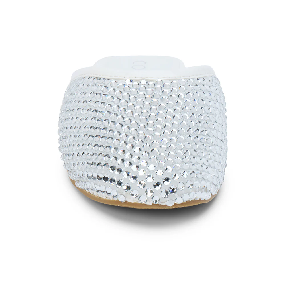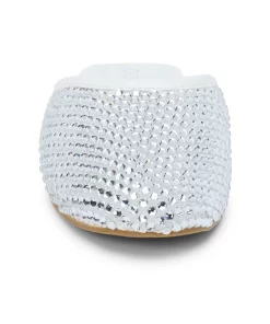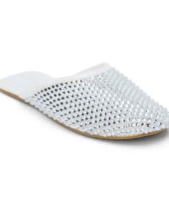 Vegan mesh slip-on mule with allover crystal rhinestones and almond toe.
