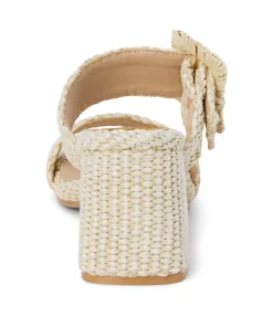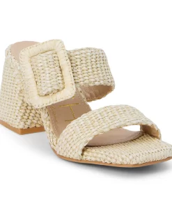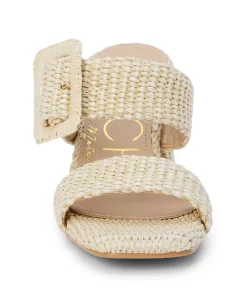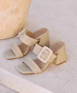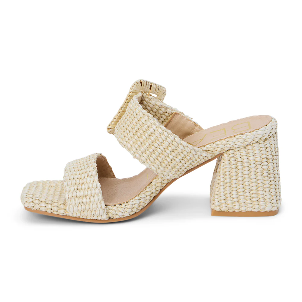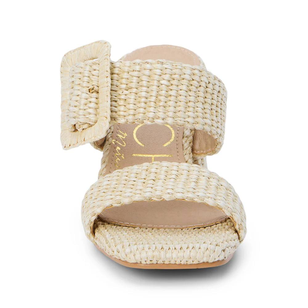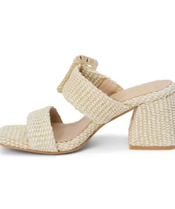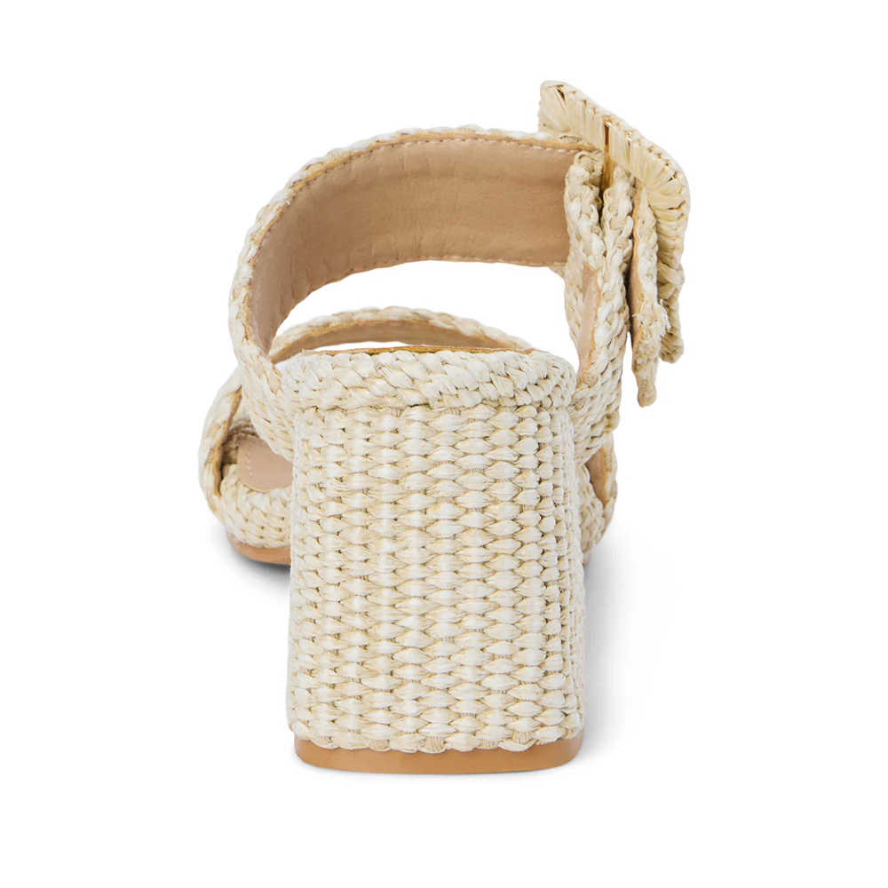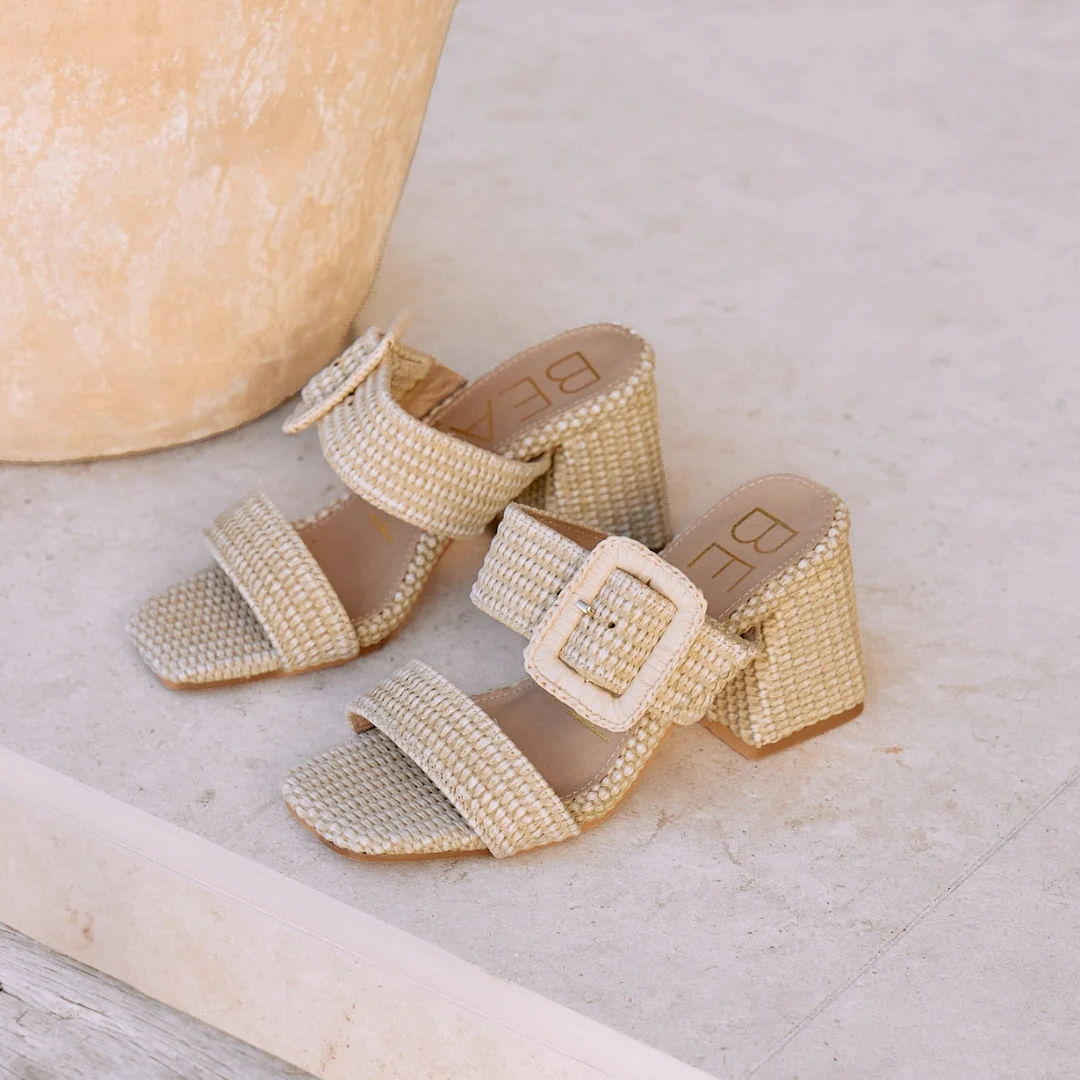 Vegan, two-band sandal with buckle detail on block heel.