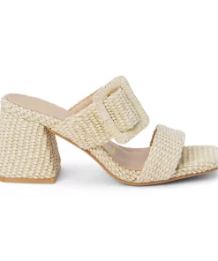 Vegan, two-band sandal with buckle detail on block heel.