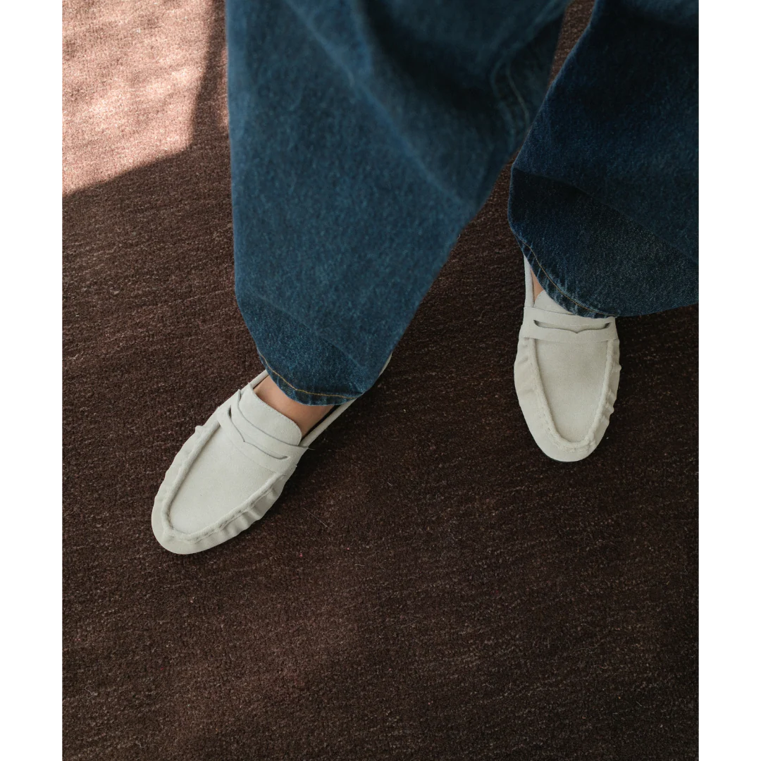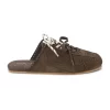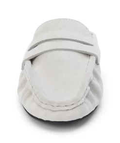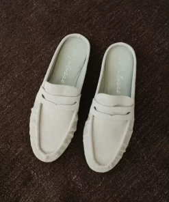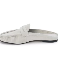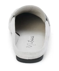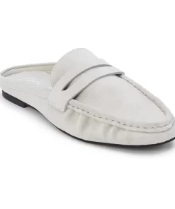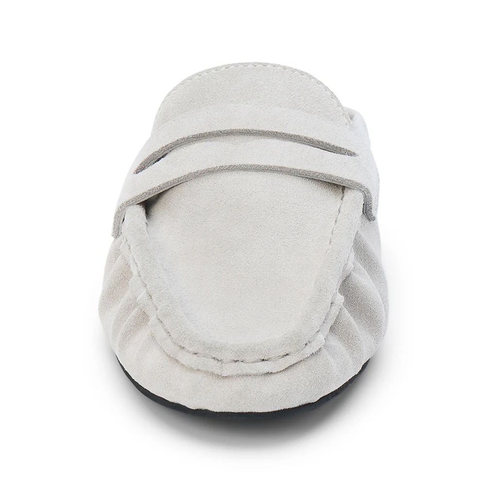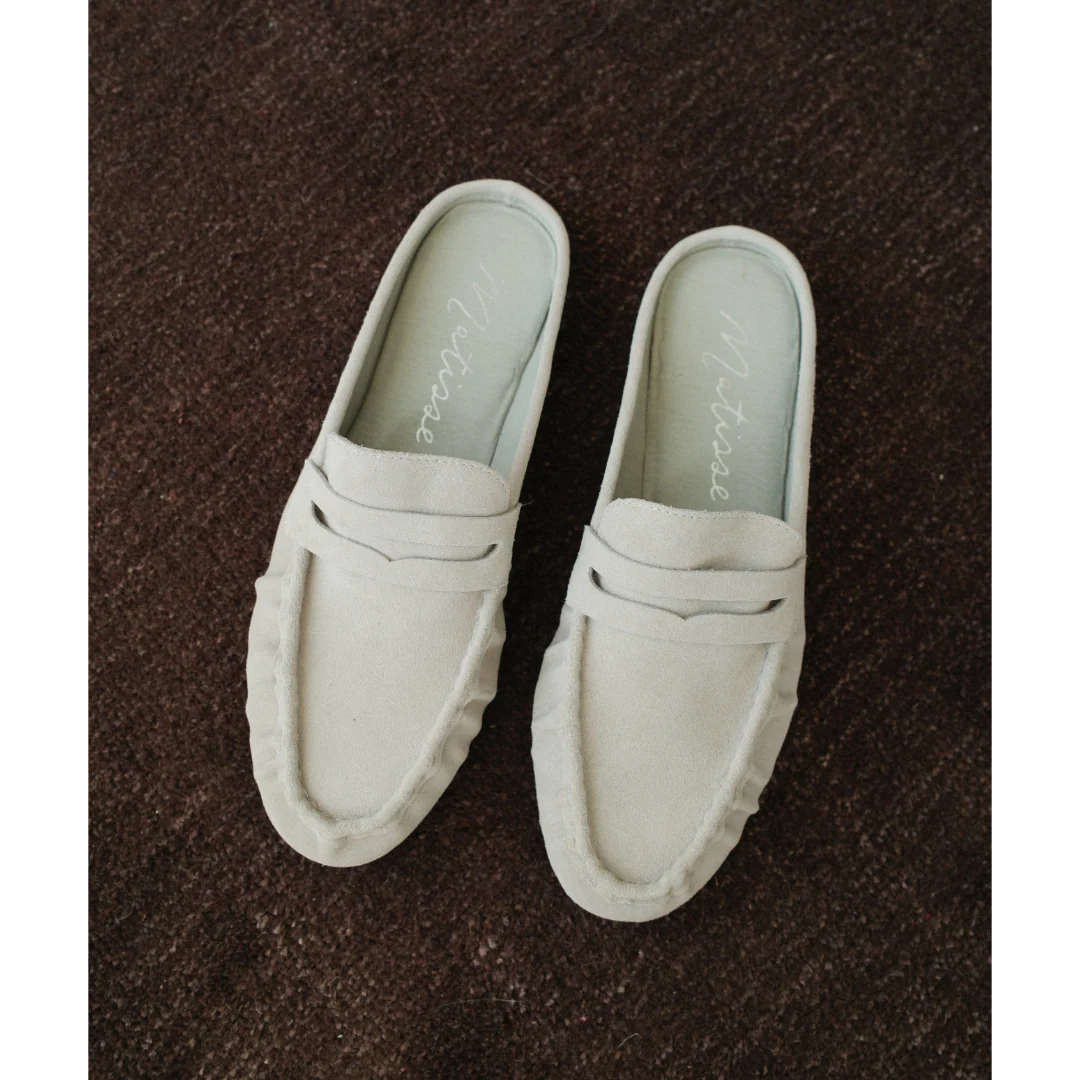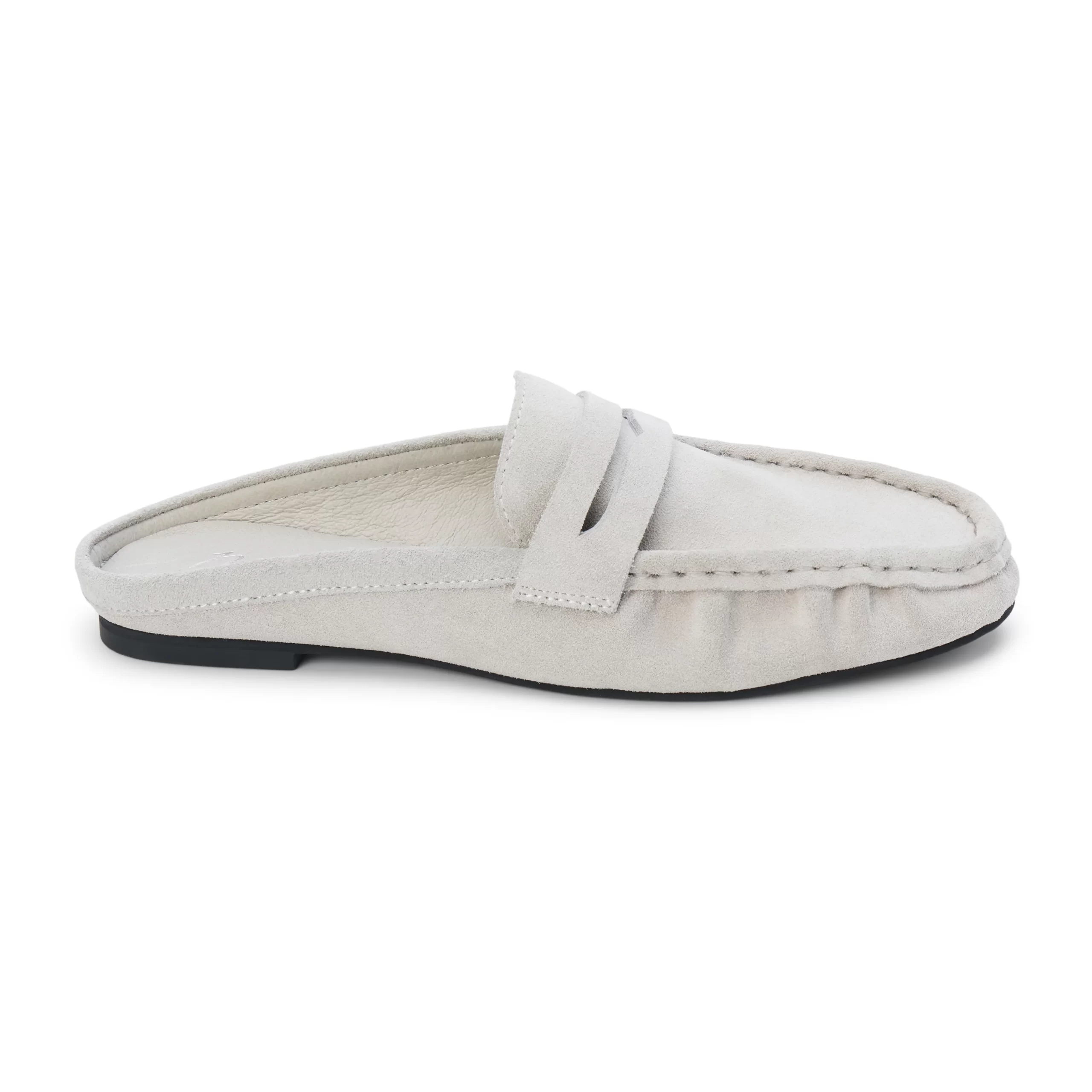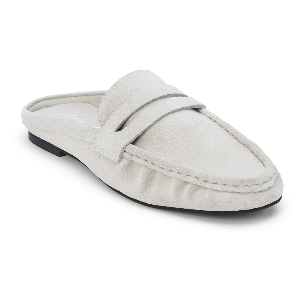 Suede slip-on mule with classic penny loafer strap and moc-toe stitching.