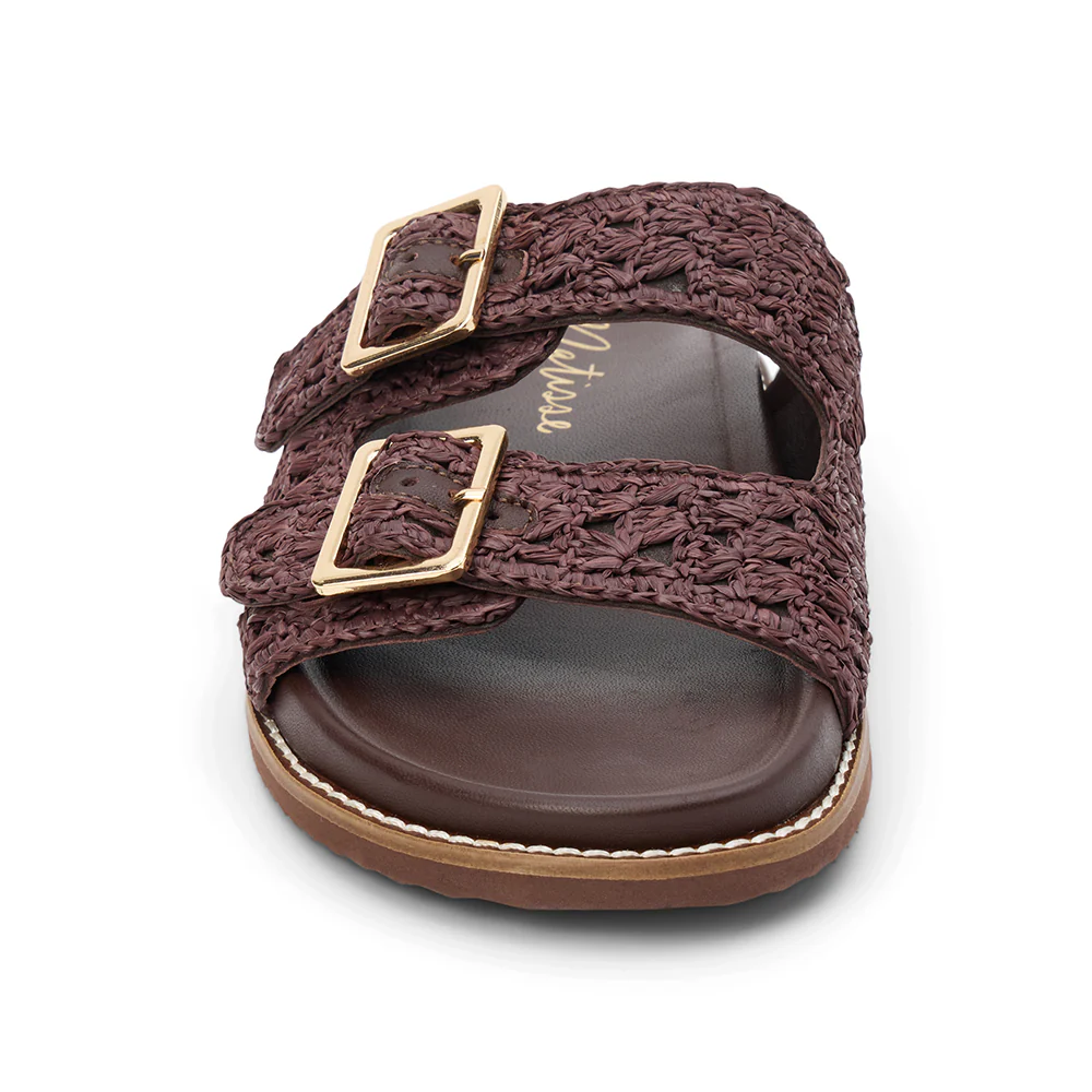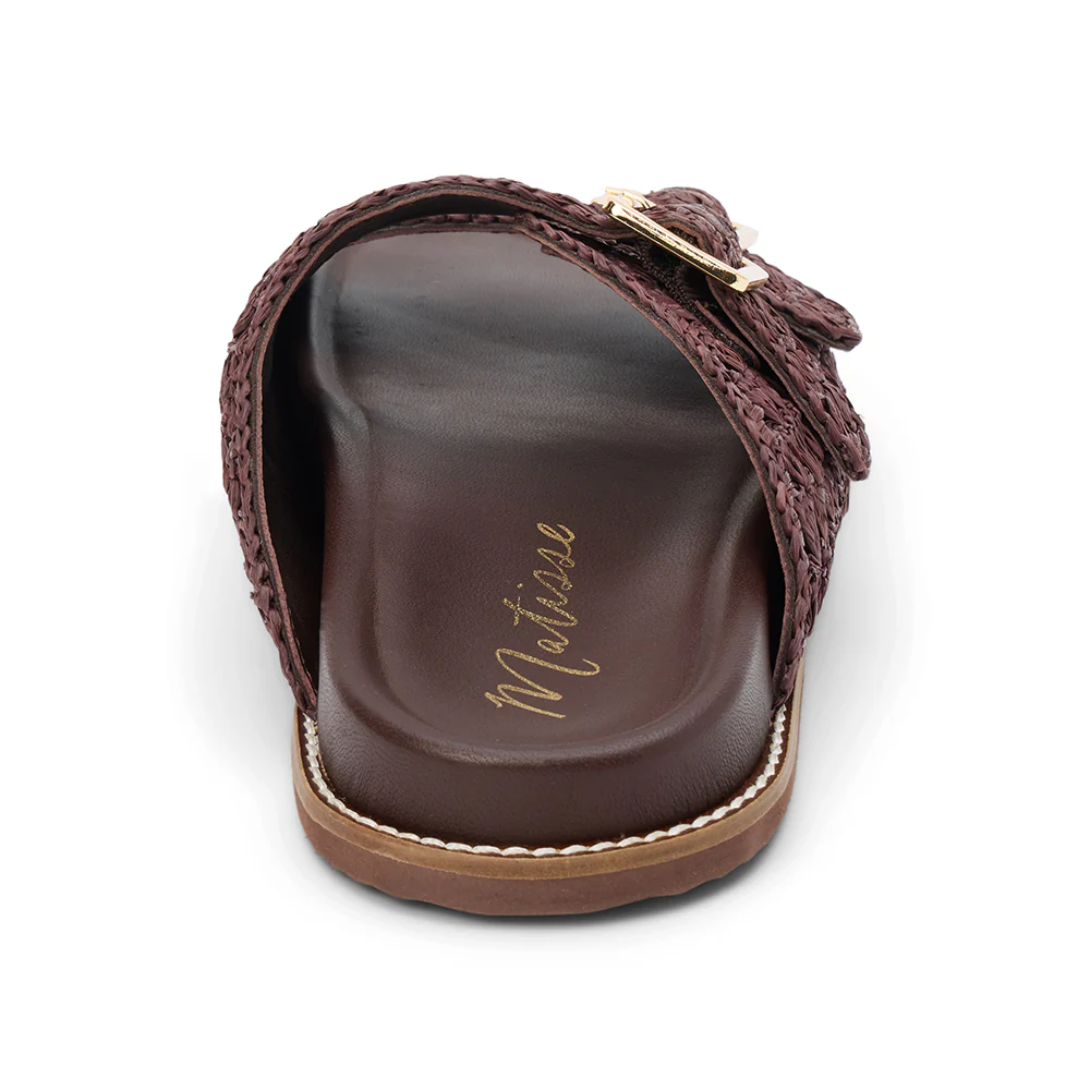 Brown woven raffia slide sandals with adjustable gold-tone buckles, a cushioned footbed, and a sturdy sole. A breezy, laid-back style perfect for warm-weather outings.