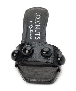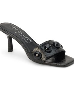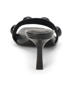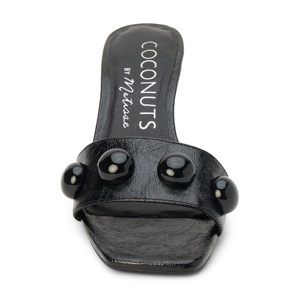 Black slip-on sandal with square toe, button embellishments, and tapered heel.