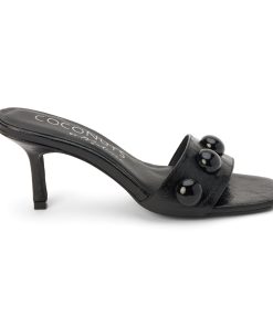 Black slip-on sandal with square toe, button embellishments, and tapered heel.