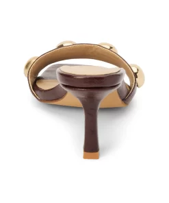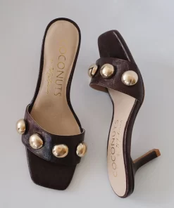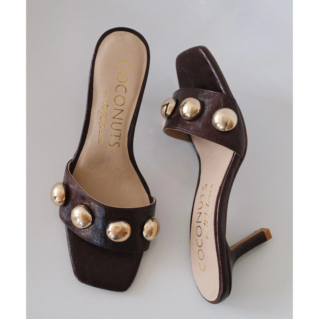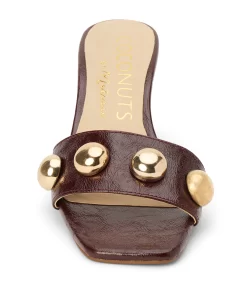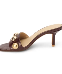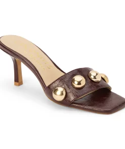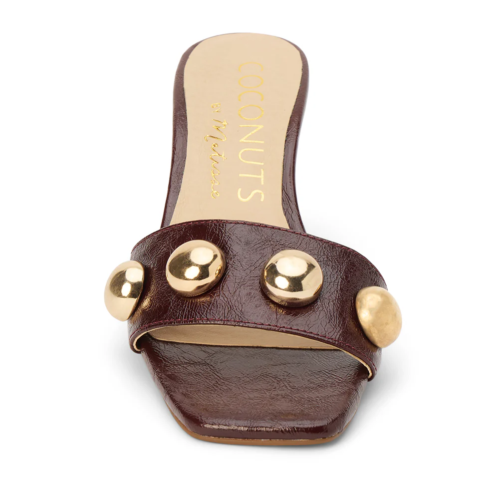 Burgundy slip-on sandal with square toe, button embellishments, and tapered heel.