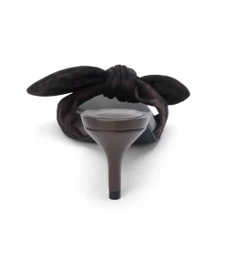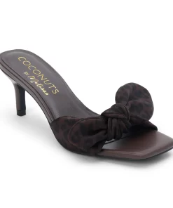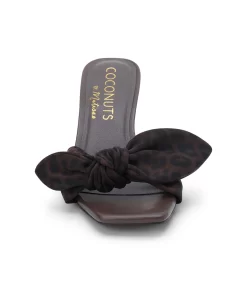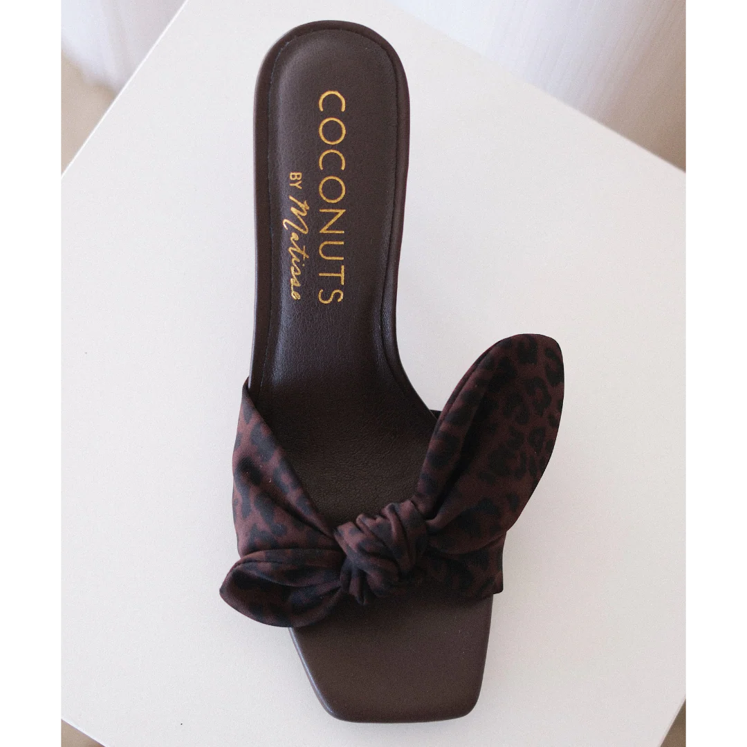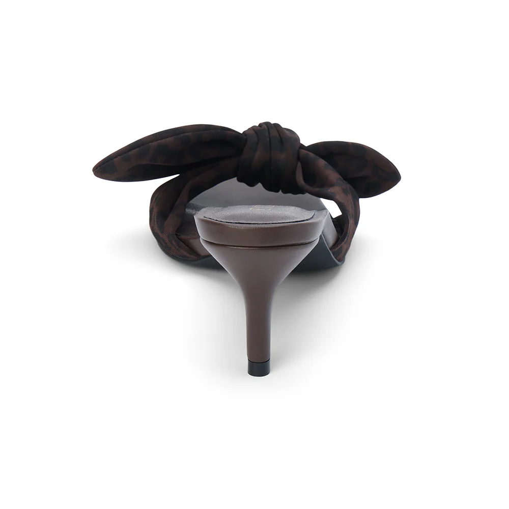 Brown slip-on sandal with square toe, leopard print bow strap, and tapered kitten heel.