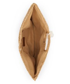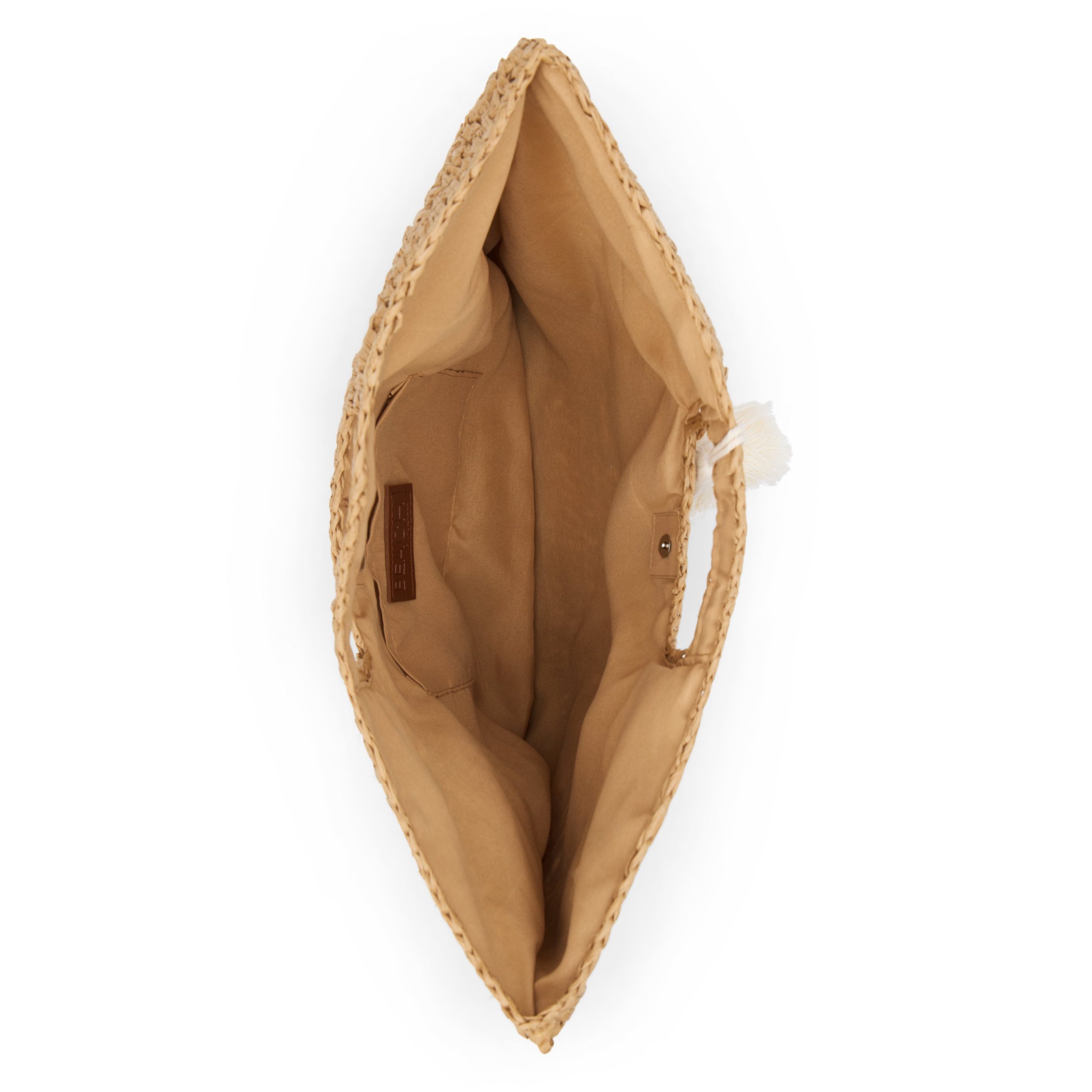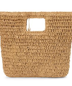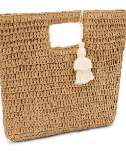 Vegan woven raffia tote bag with a cutout top handle and tassel ornament, offering a stylish and practical accessory for summer or beach outings.