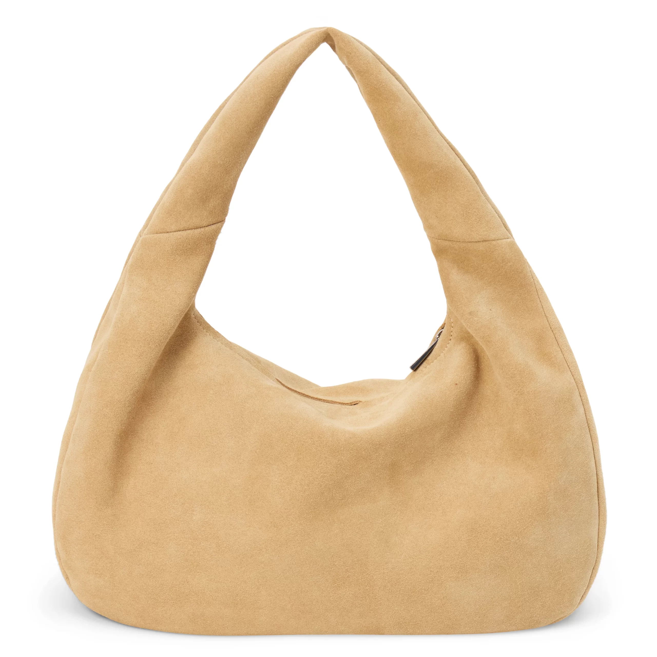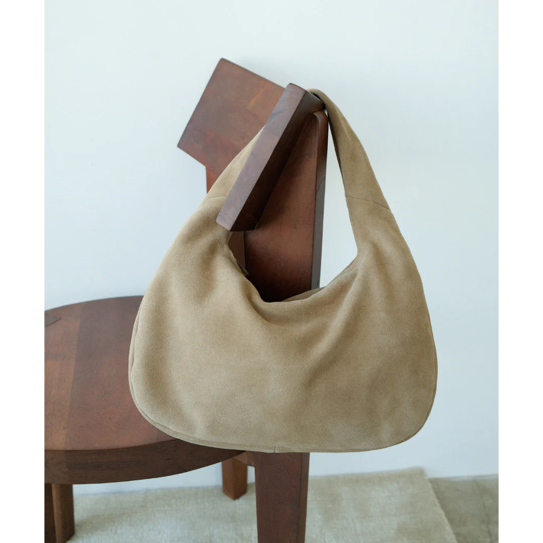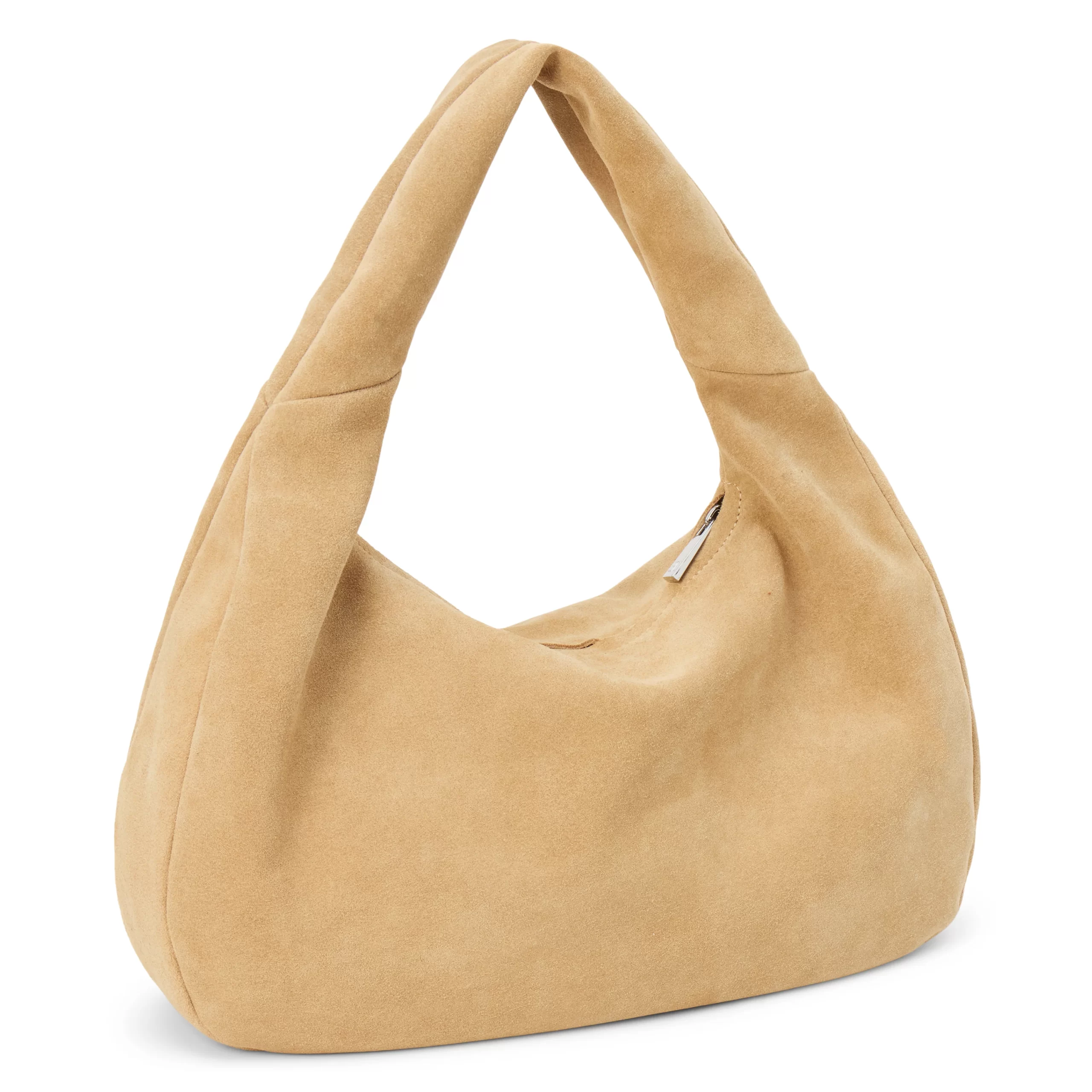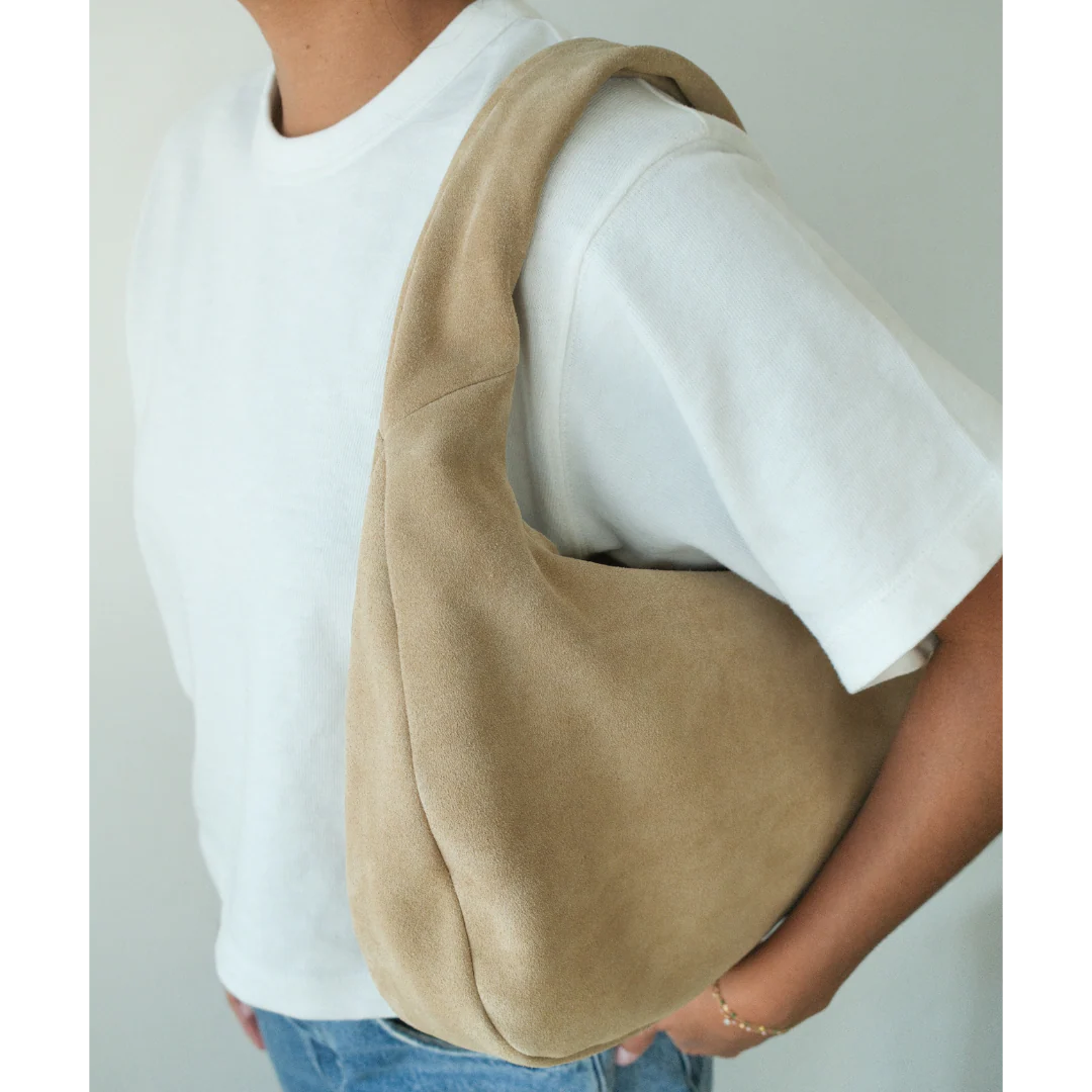 Slouchy suede shoulder bag with wide strap and curved silhouette.