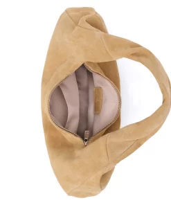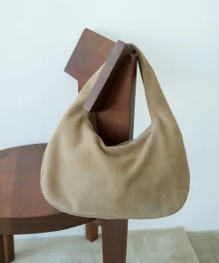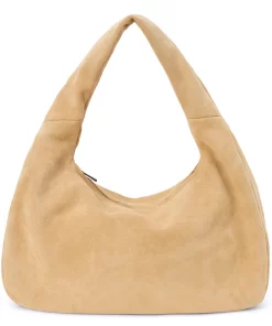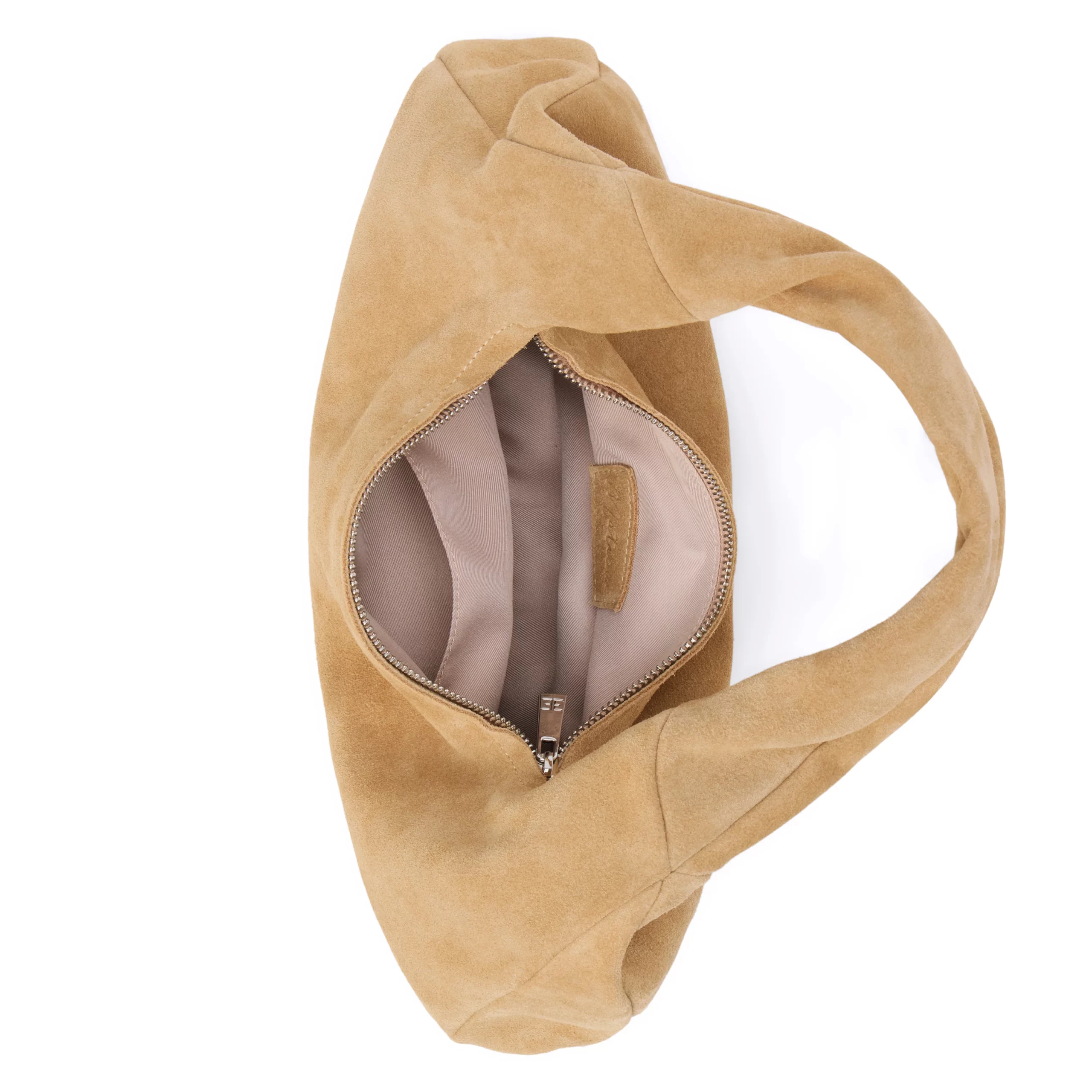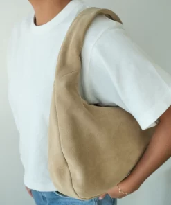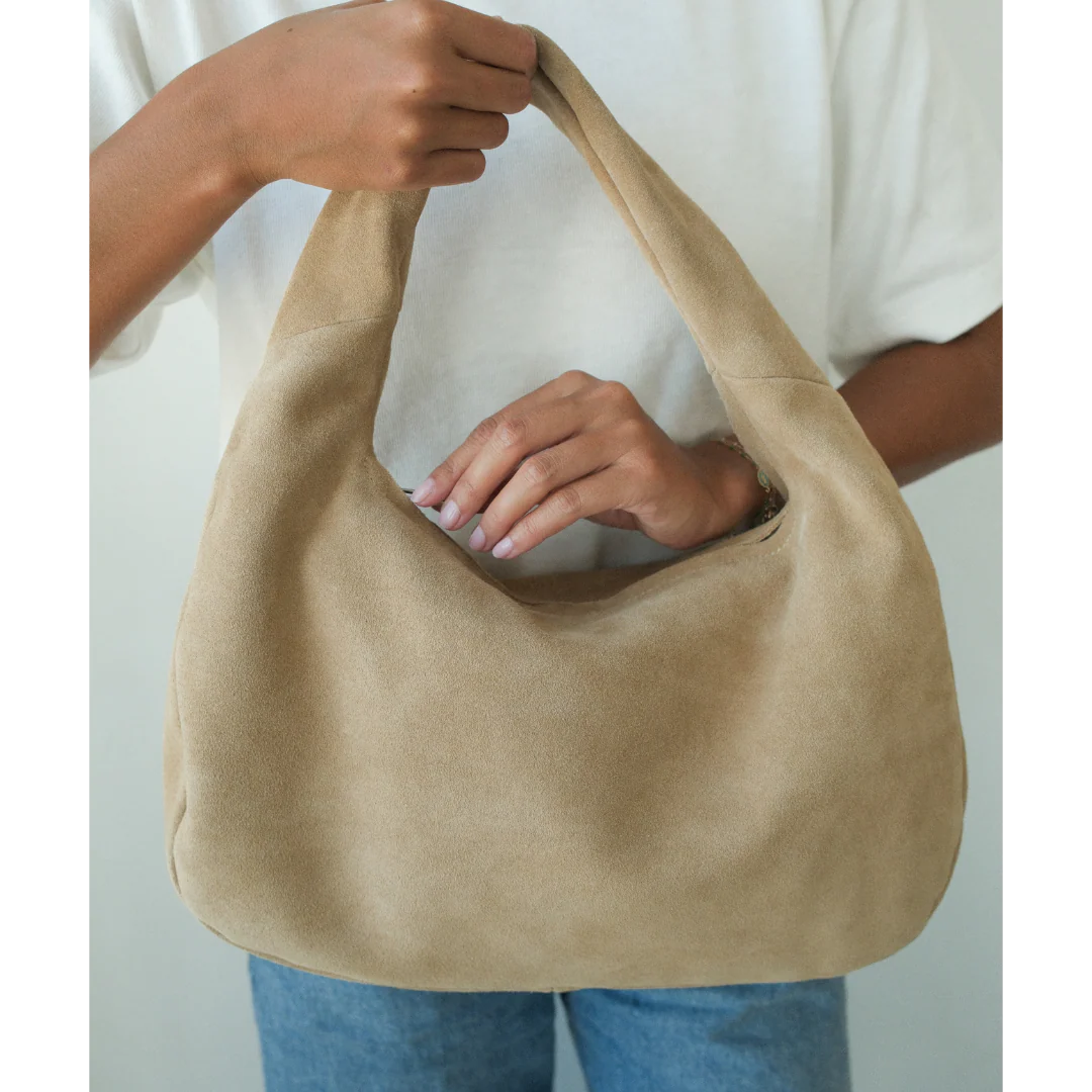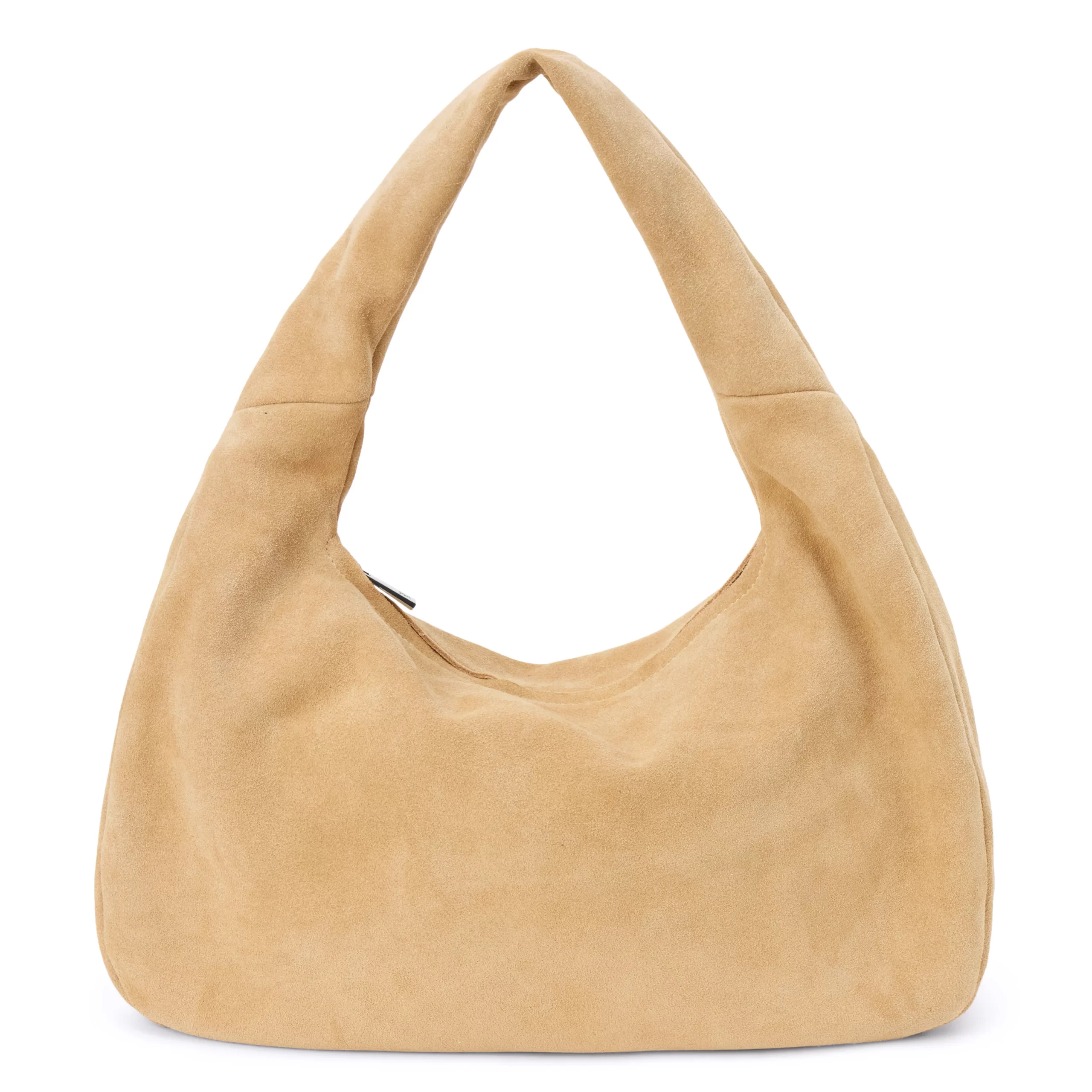 Slouchy suede shoulder bag with wide strap and curved silhouette.
