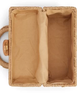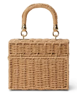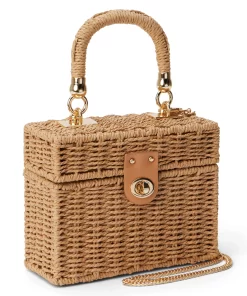 Vegan, small picnic-style raffia bag with top handle and chain strap.