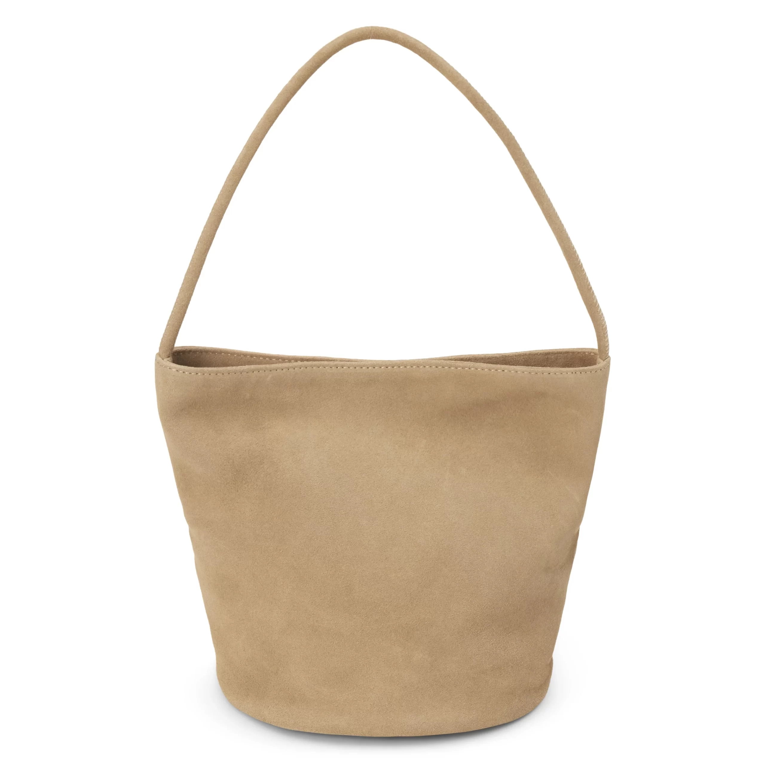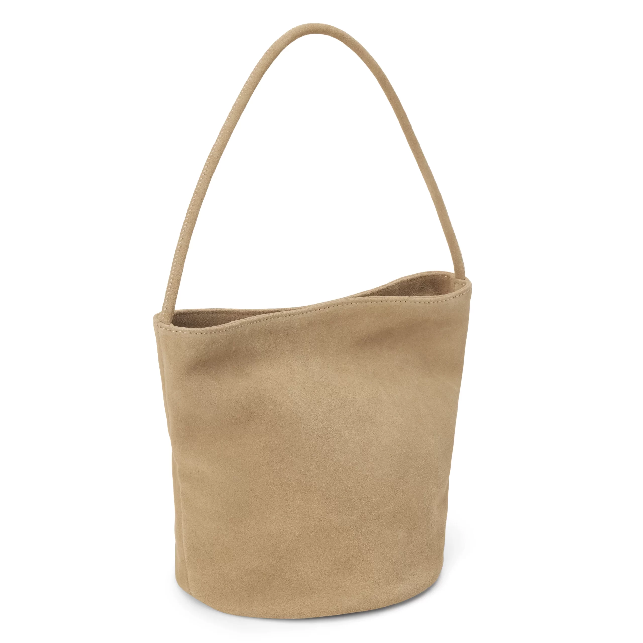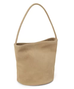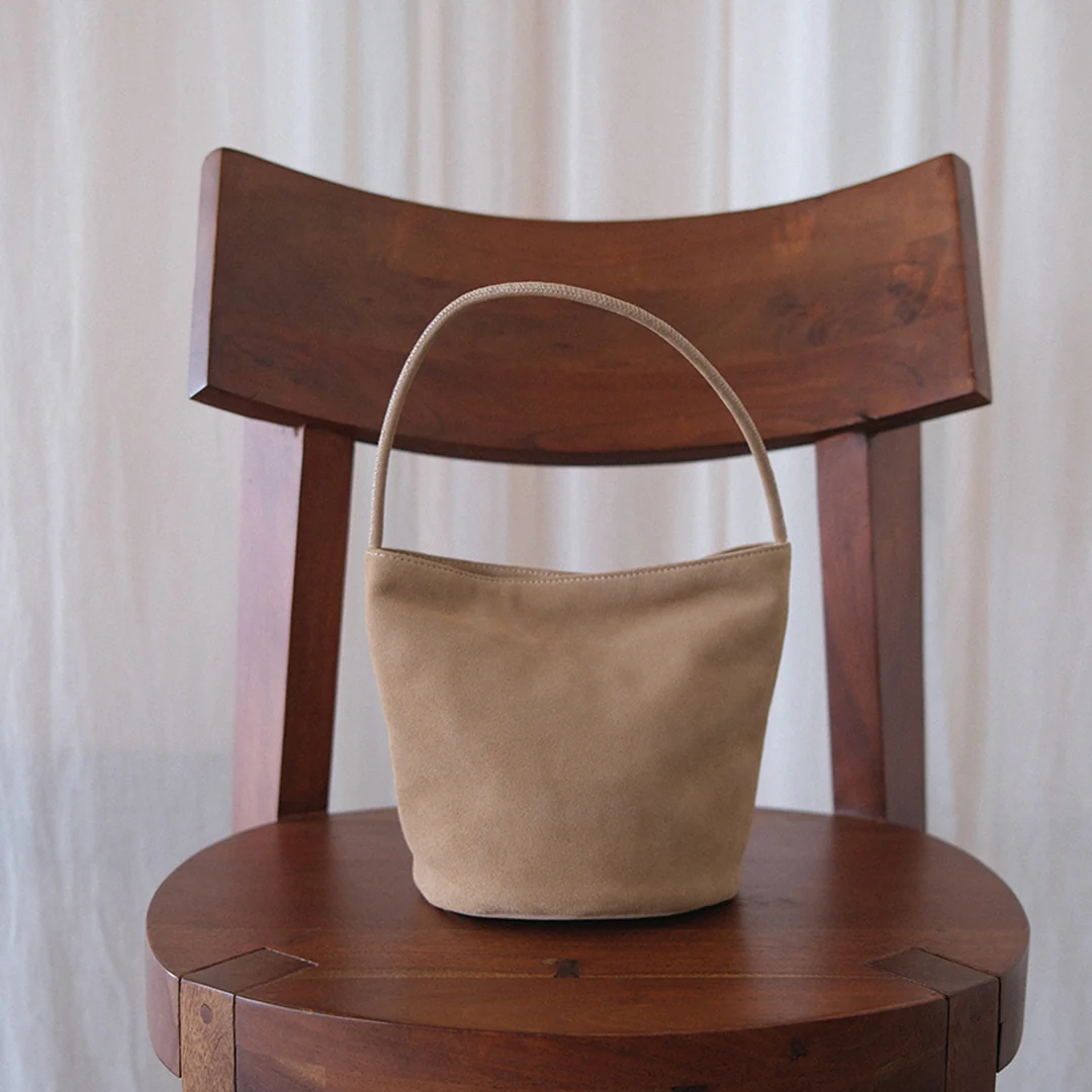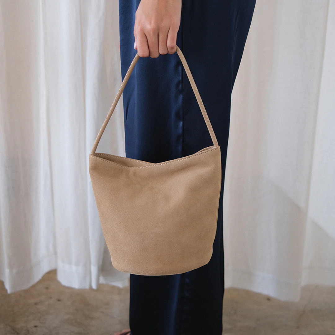 Small suede bucket bag with interior wall pocket and magnetic closure.
