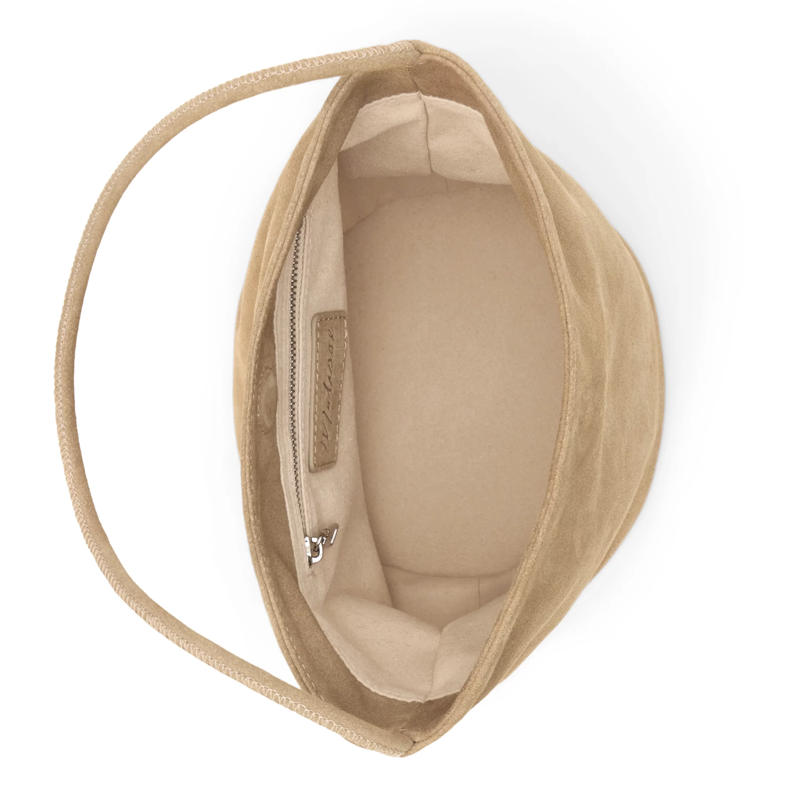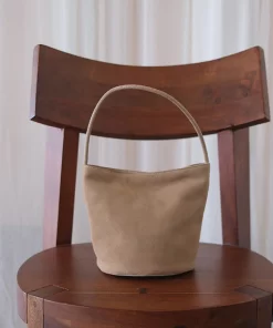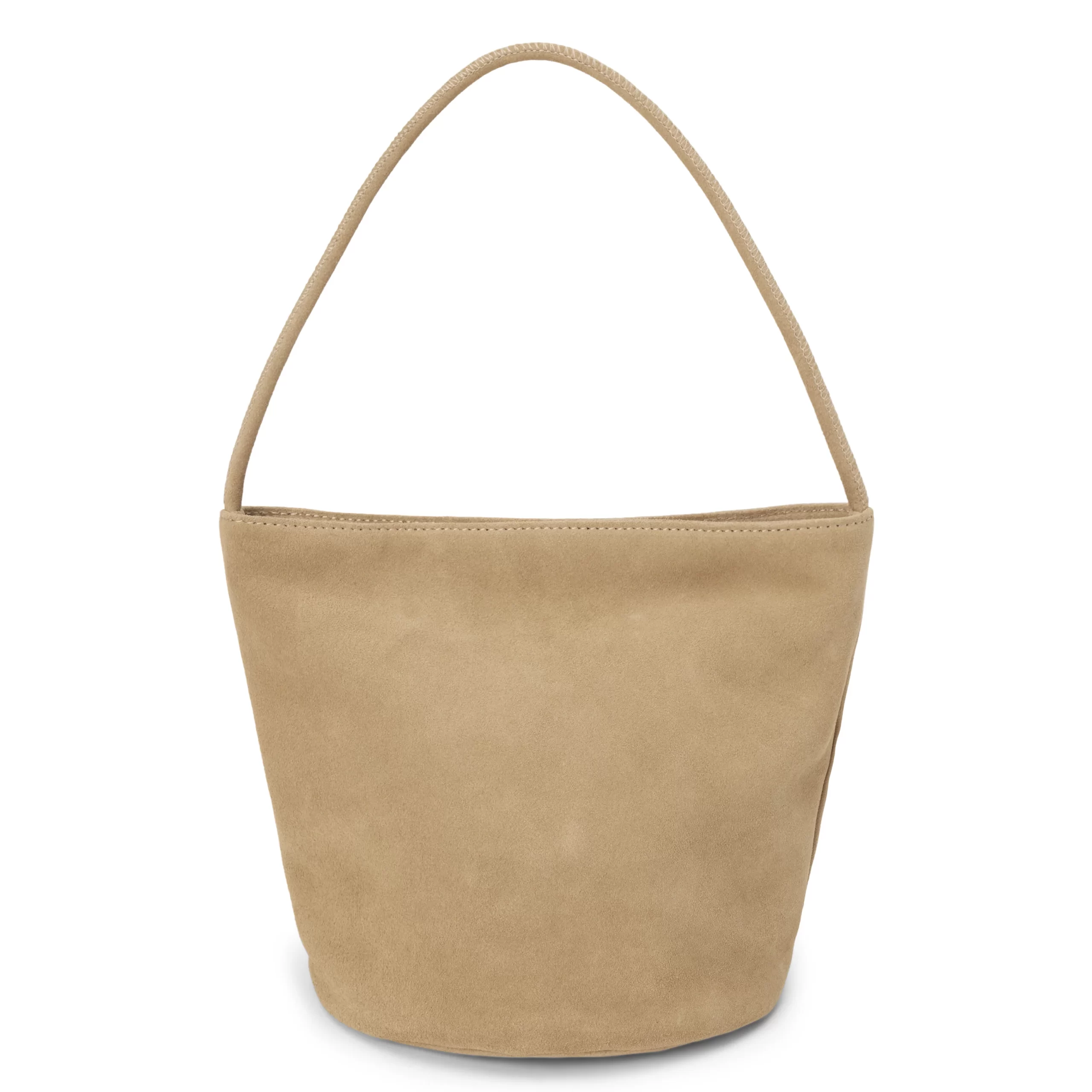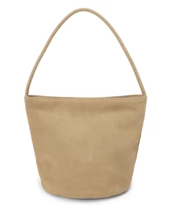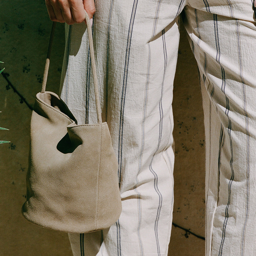 Small suede bucket bag with interior wall pocket and magnetic closure.